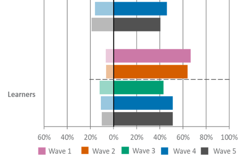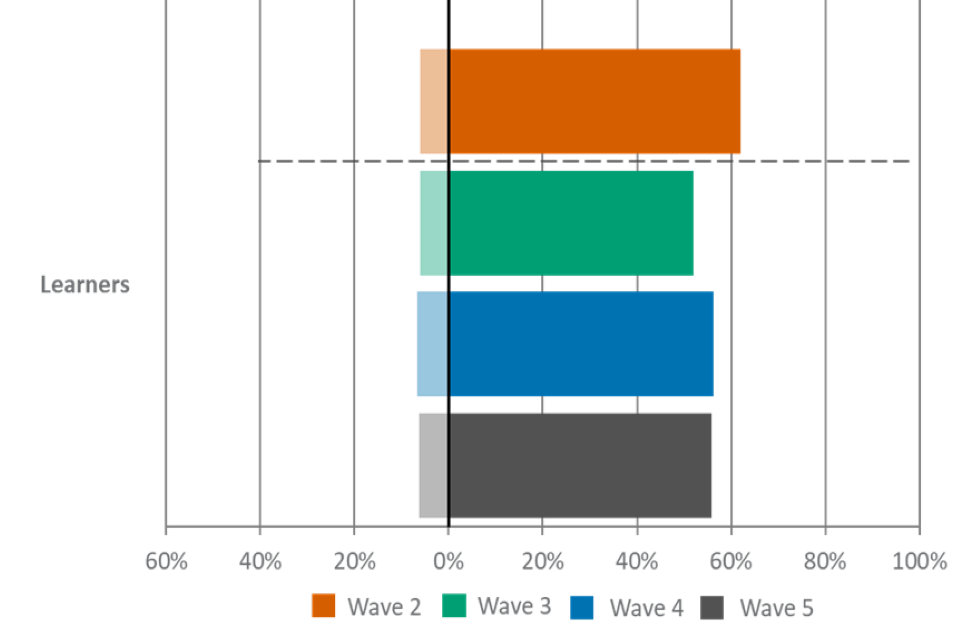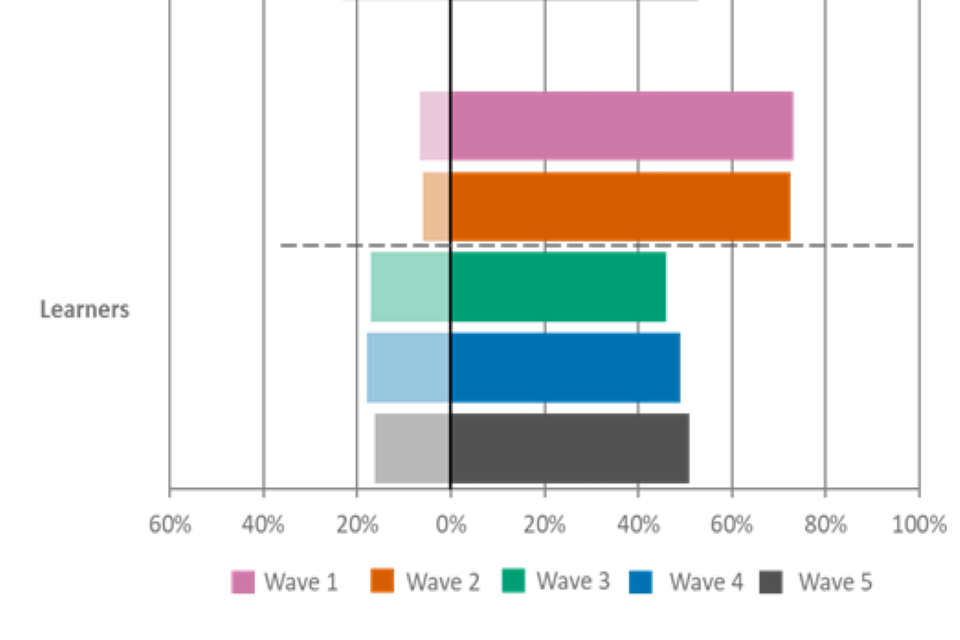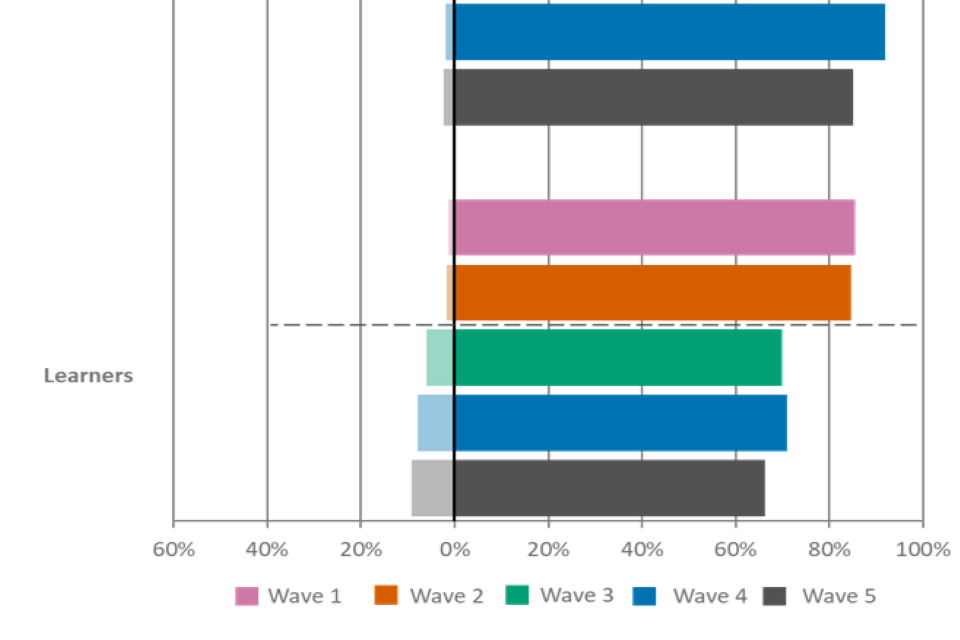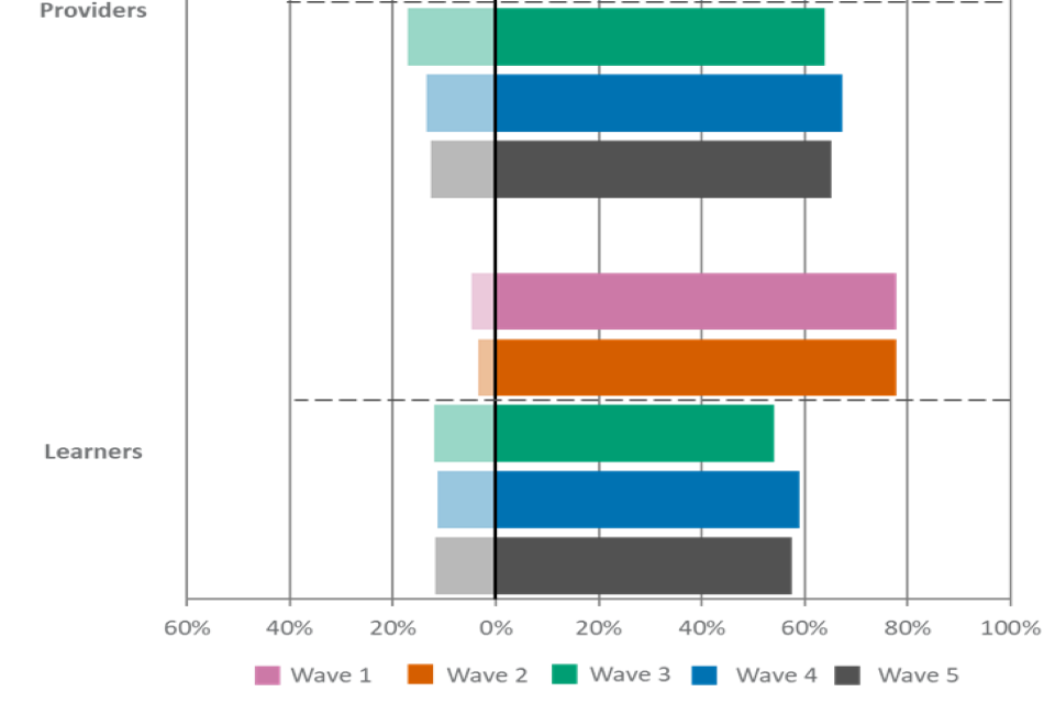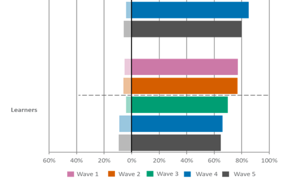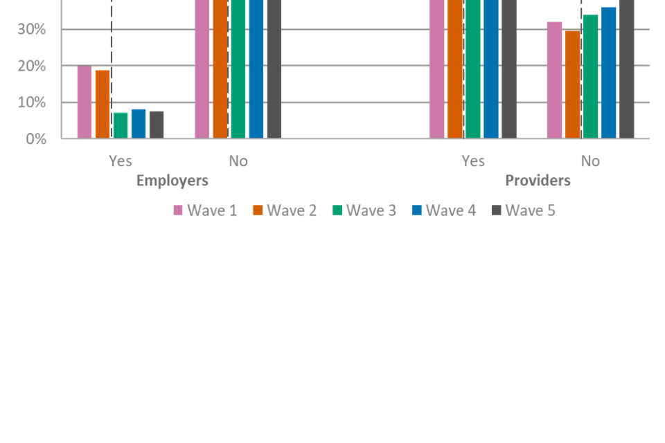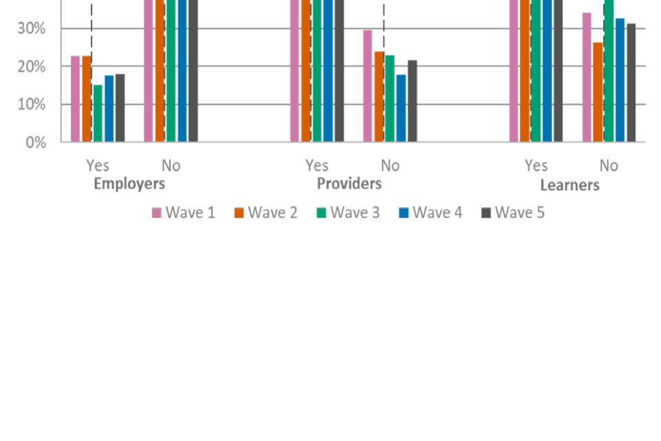 For figures 1, 2 and 3, the wave 5 unweighted base is: All employers, n=2,002, all providers, n=539, all learners, n=533.