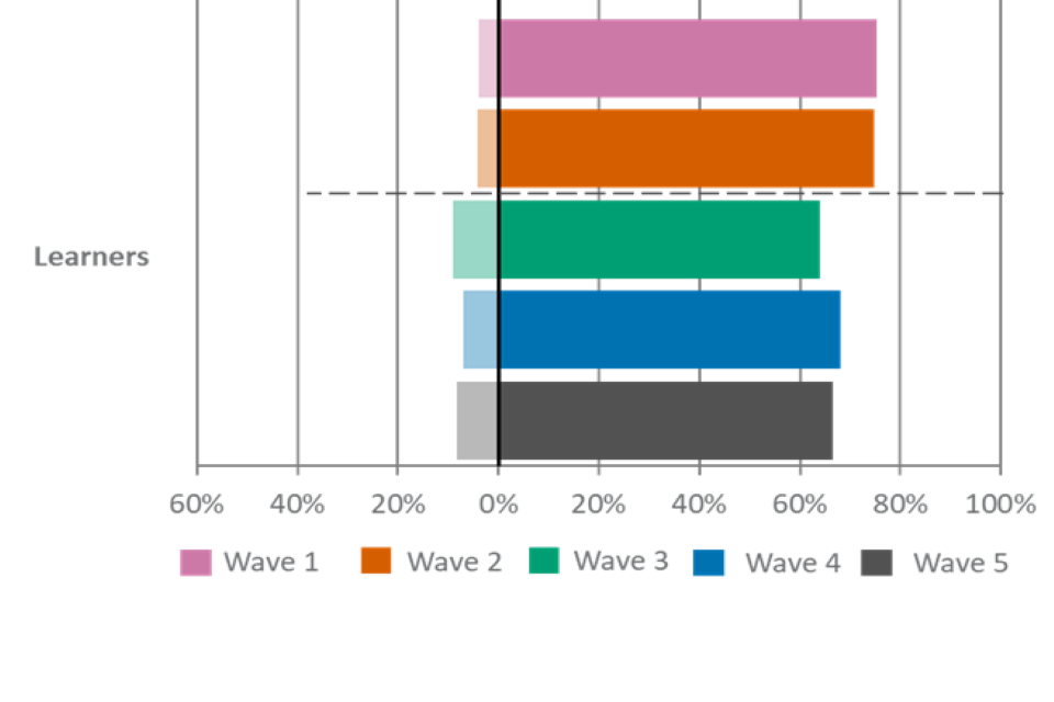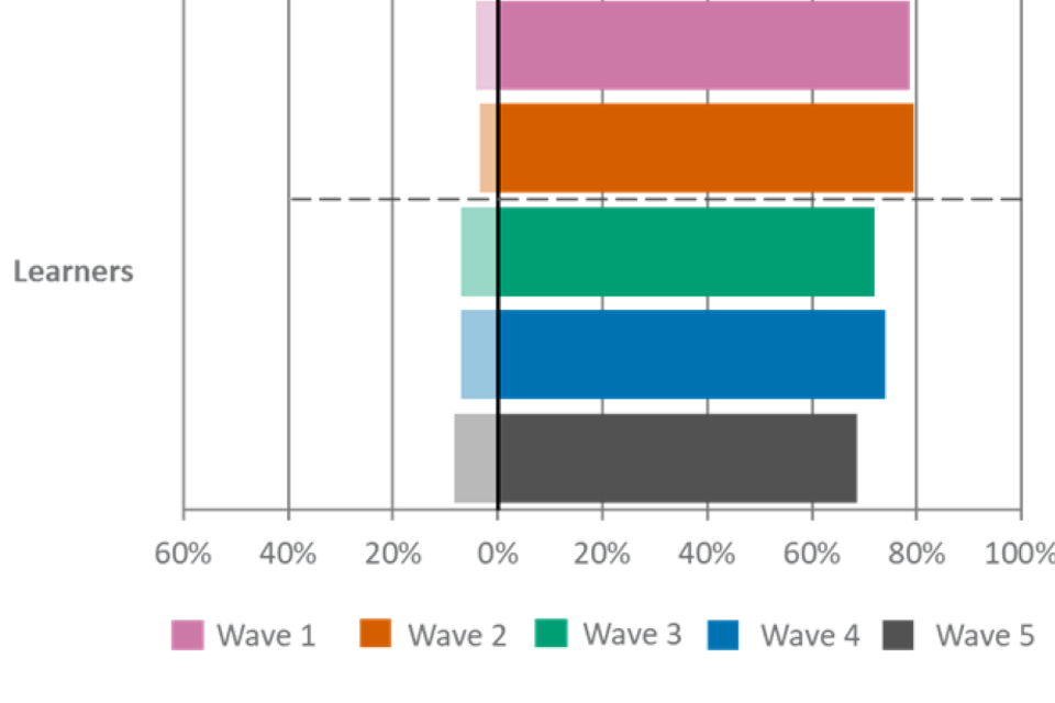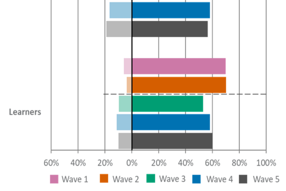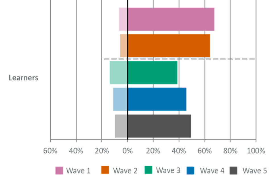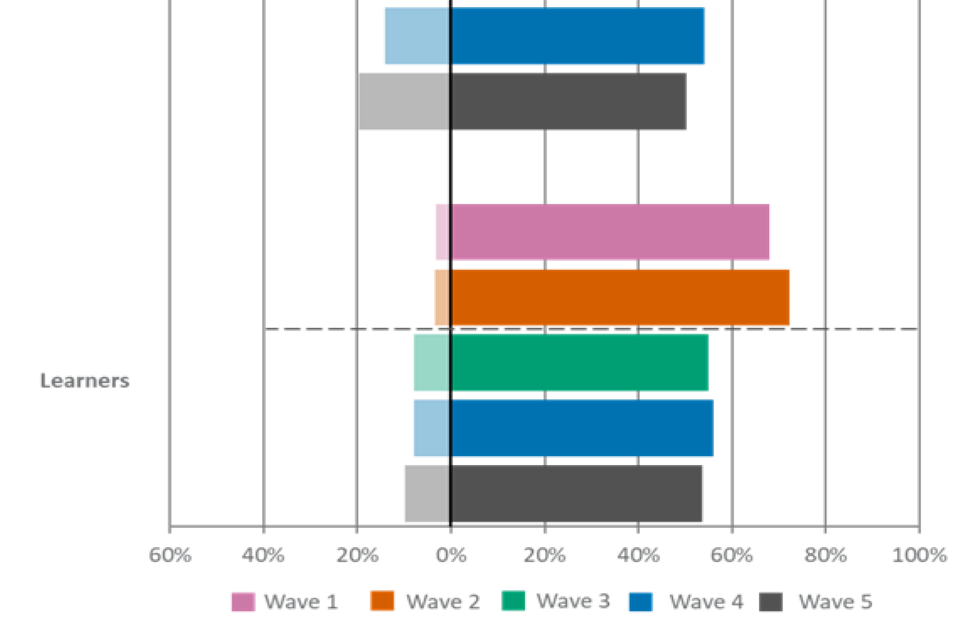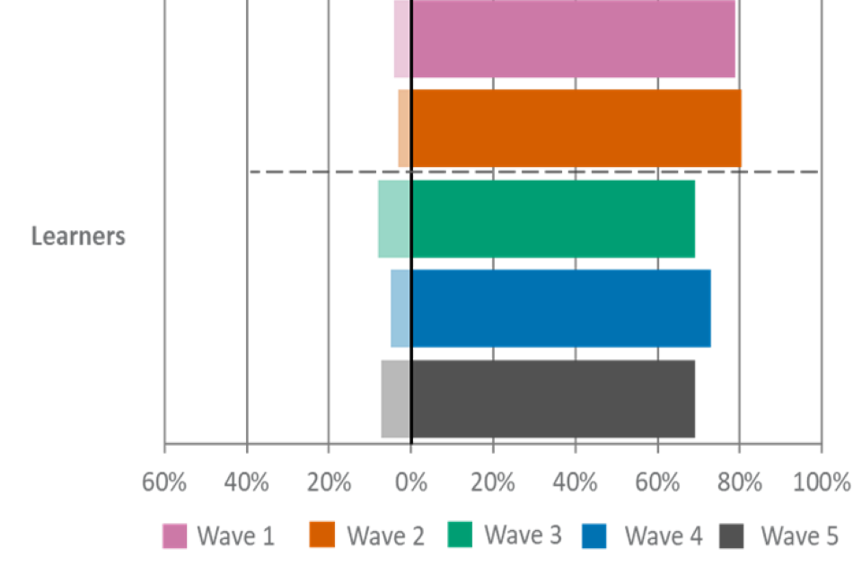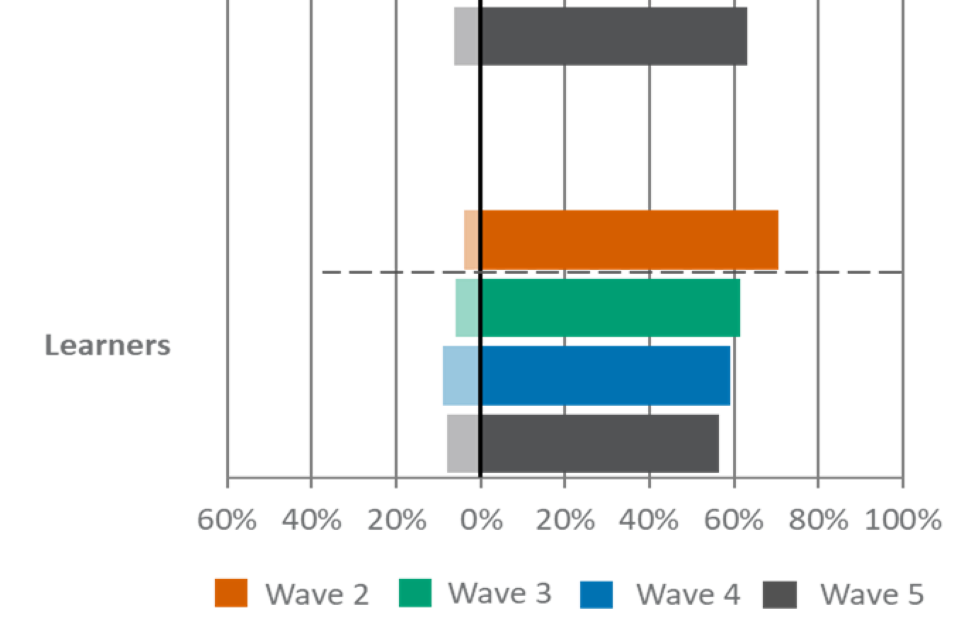 For figures 1, 2 and 3, the wave 5 unweighted base is: All employers, n=2,002, all providers, n=539, all learners, n=533.