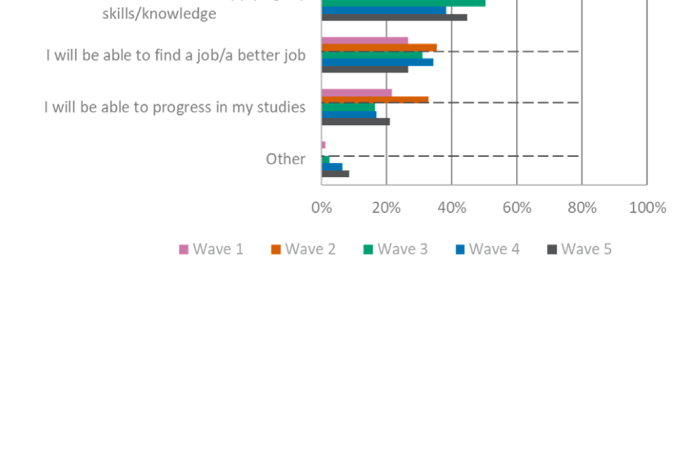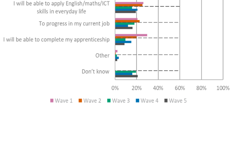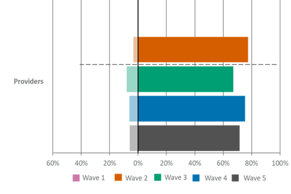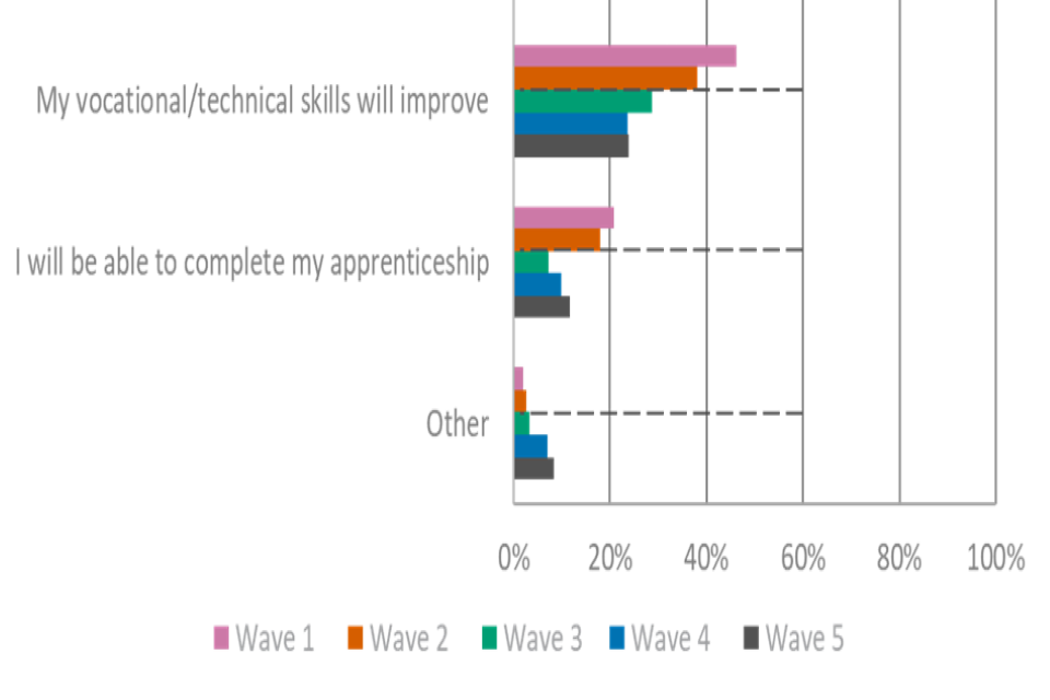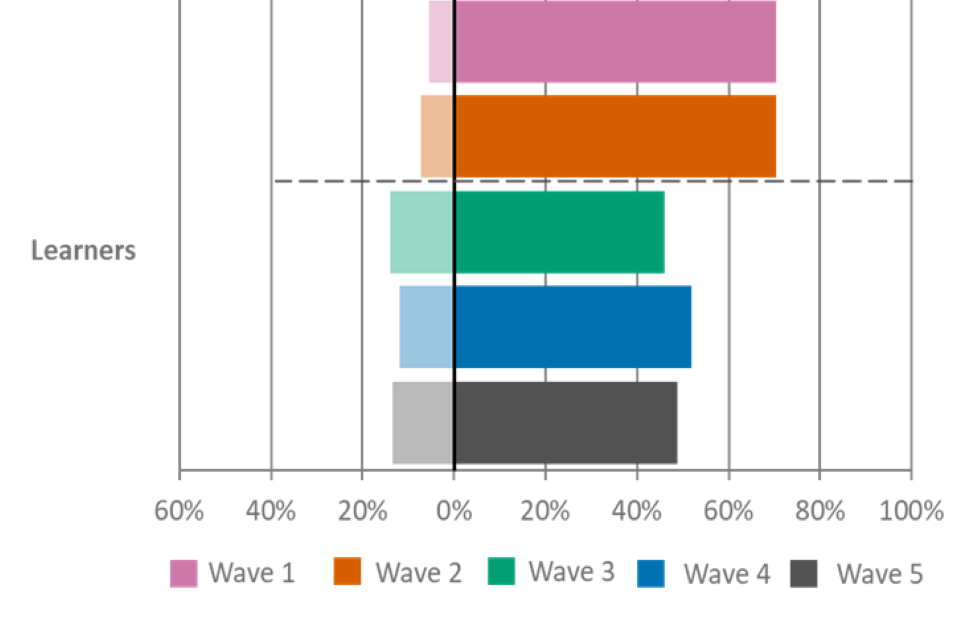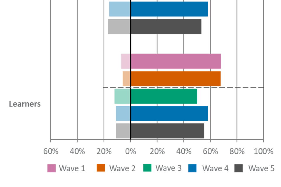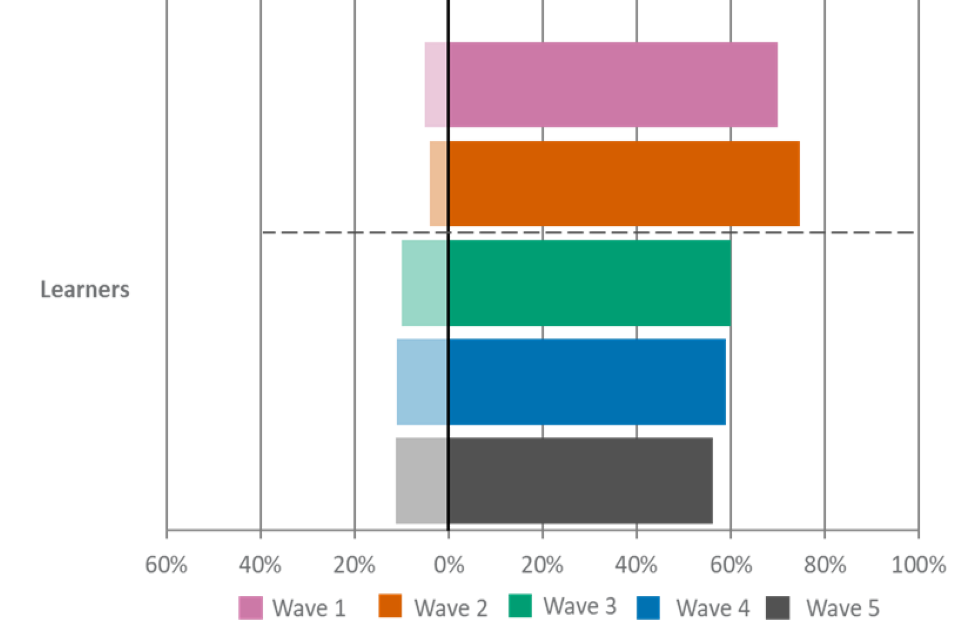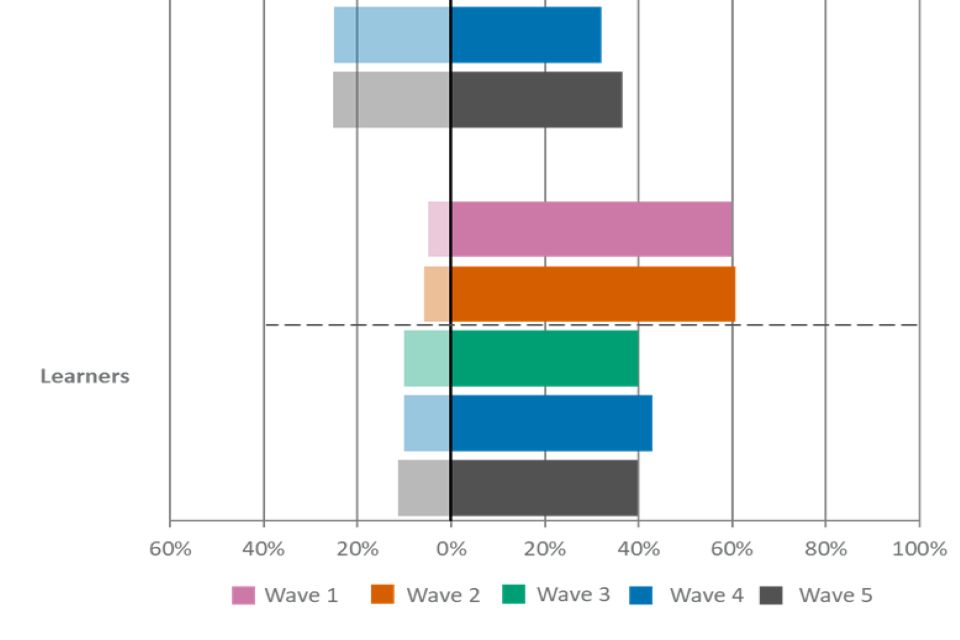 For figures 1, 2 and 3, the wave 5 unweighted base is: All employers, n=2,002, all providers, n=539, all learners, n=533.