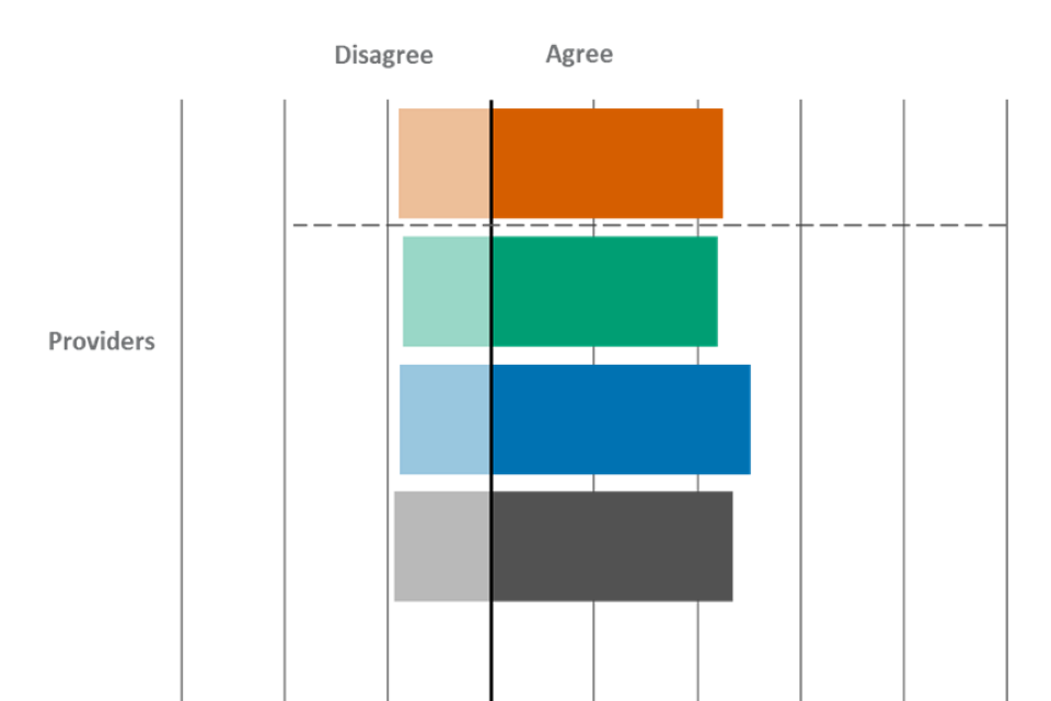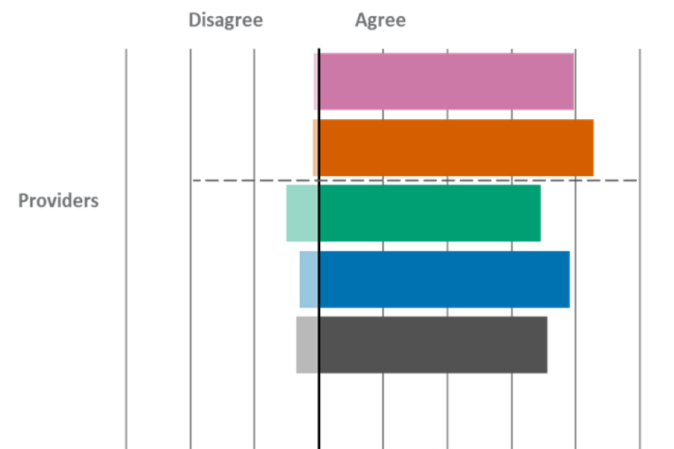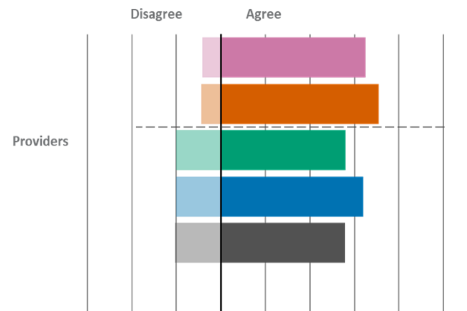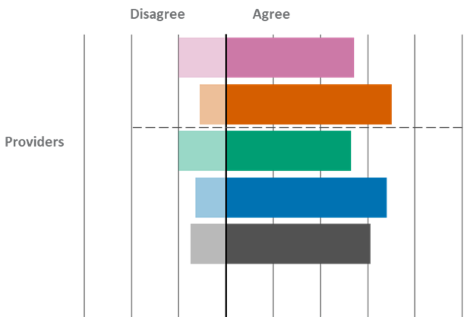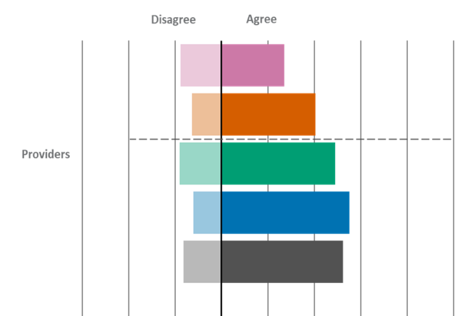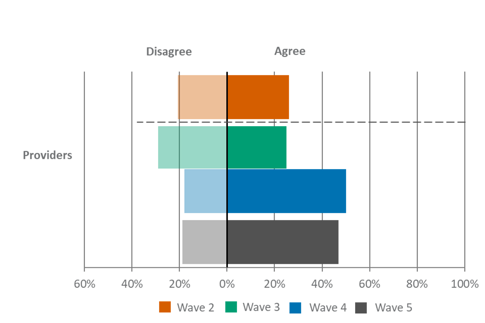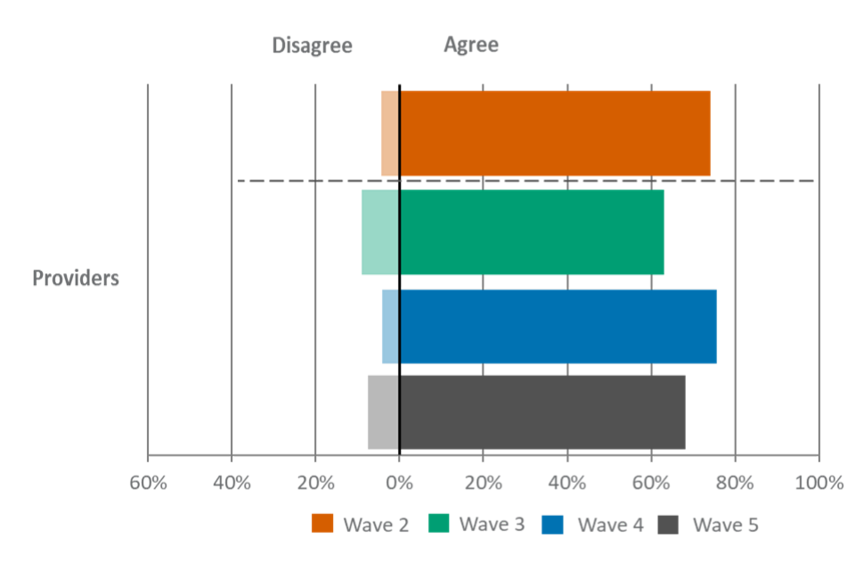 Providers were also the most likely group to agree that they value FSQs, with 65% agreeing. This finding was also observed in wave 4. Just under half of providers (47%) agreed that FSQs offer value for money, which was again broadly comparable to wave 4.