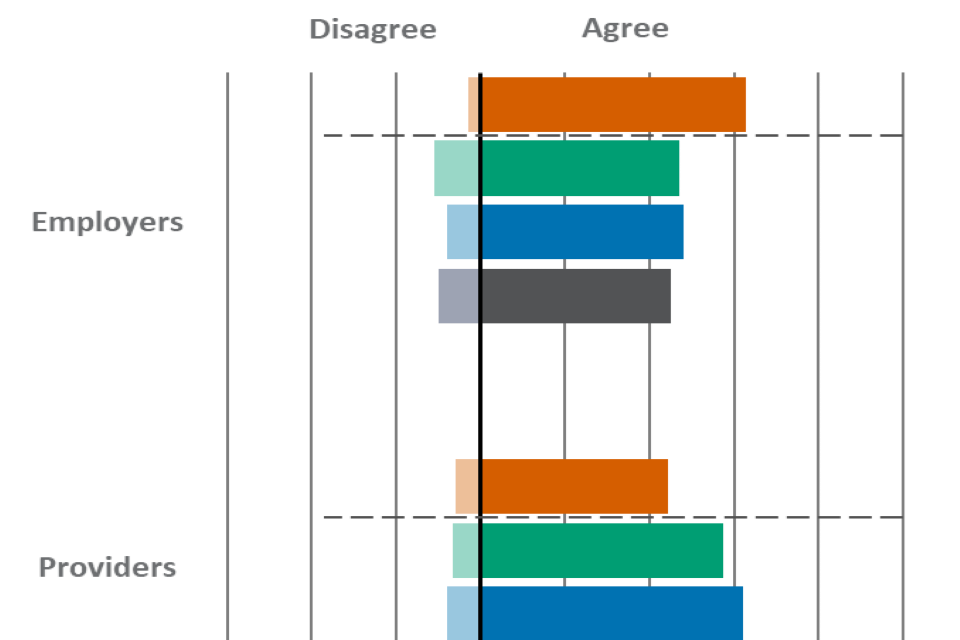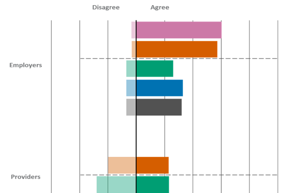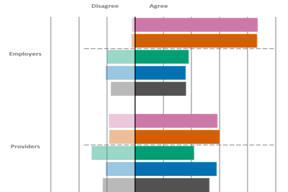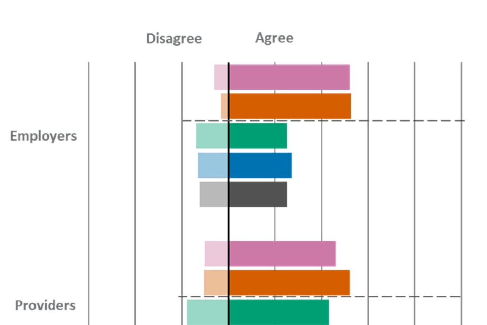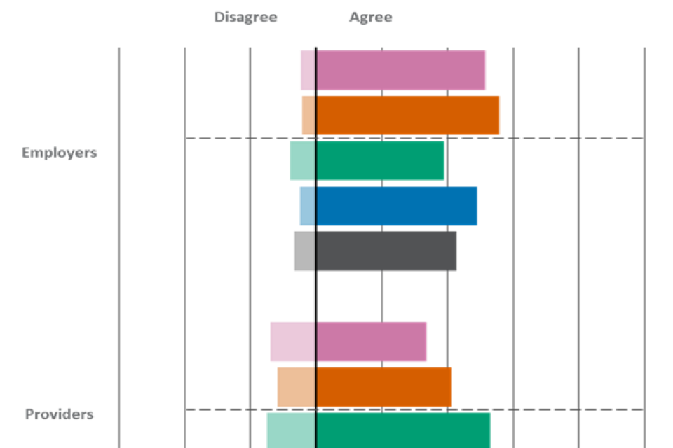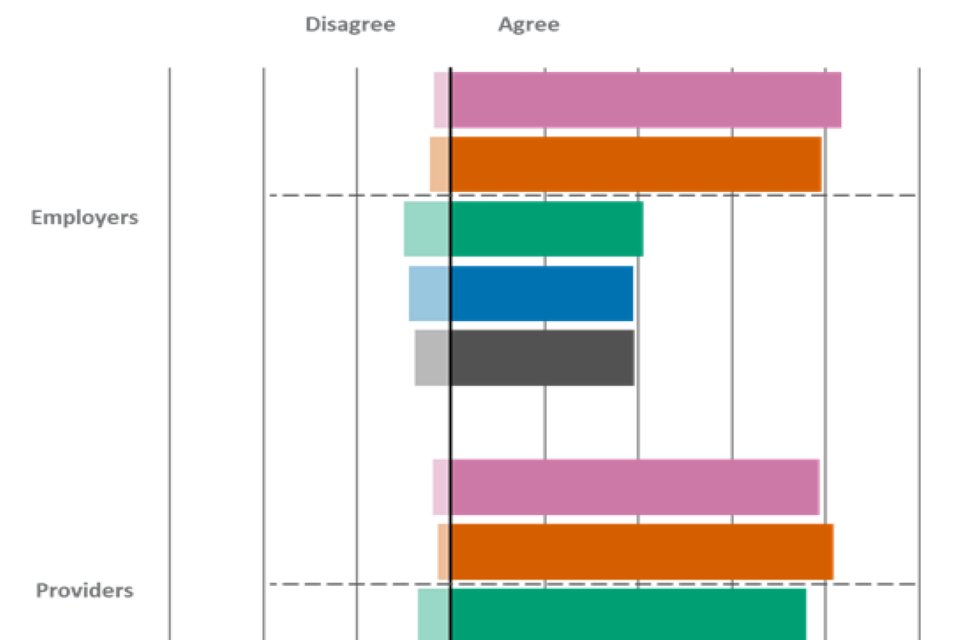 | Statement | Employers - Agree | Employers - Disagree | Providers - Agree | Providers - Disagree | Learners - Agree | Learners - Disagree |
