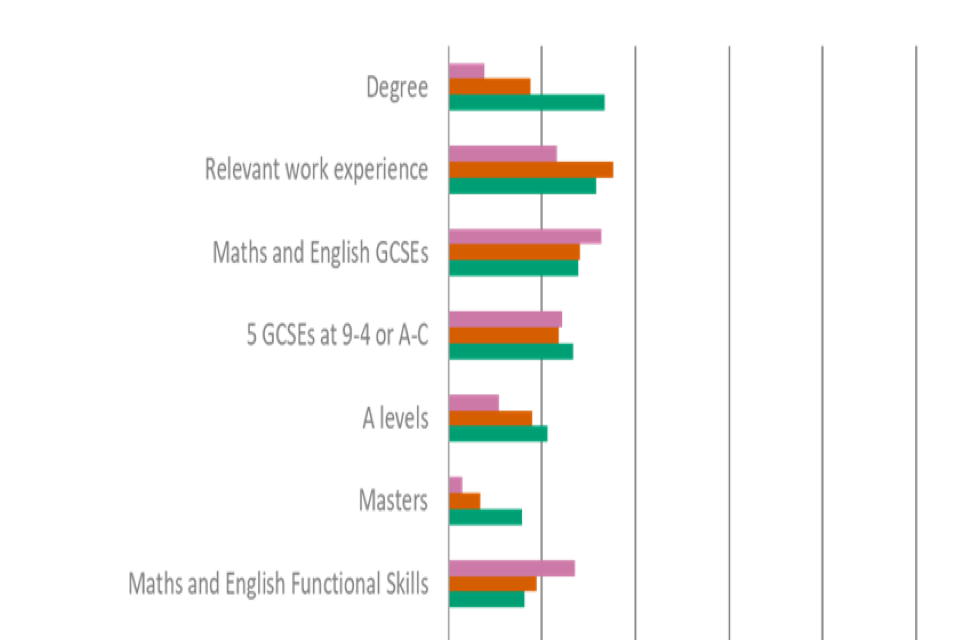 Figure 45. Results for ‘When recruiting new employees, are any of the following essential for the following types of roles’ (Employers)