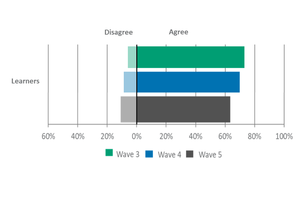In general, learners were knowledgeable about VTQs, FSQs, and apprenticeship EPAs, often having similar perceptions to providers. Approximately two-thirds (69%) of learners agreed that they understand the purpose of VTQs, which has decreased slightly from 74% in wave 4 (although this level was comparable to wave 3).