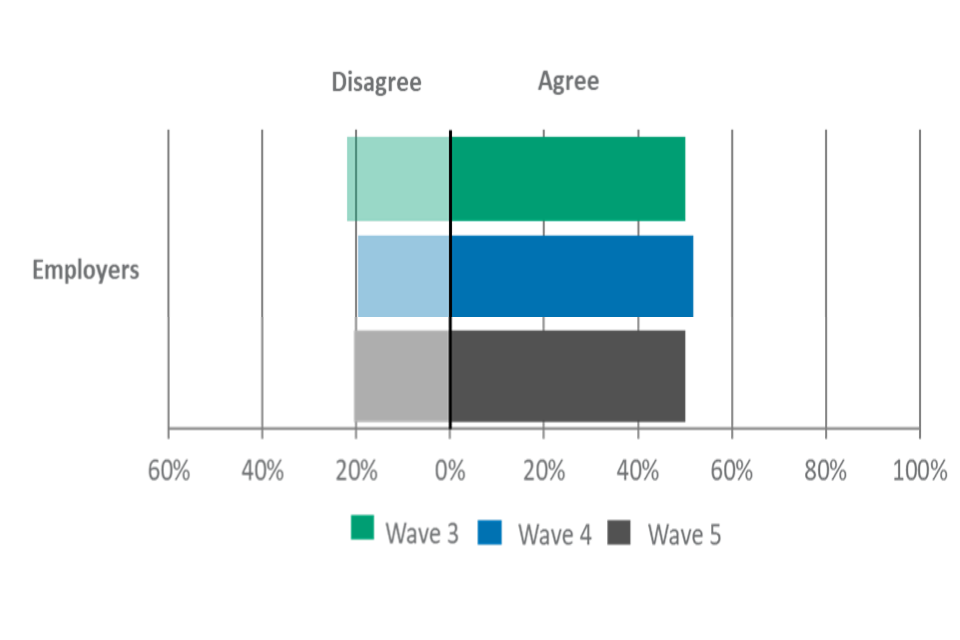 The proportion agreeing that people achieving VTQs have the skills needed by employers, or their organisation, also remained comparable with wave 4. There were stark differences in levels of agreement among employers and providers. Seven in ten (72%) providers agreed with this, compared to three in ten (33%) employers