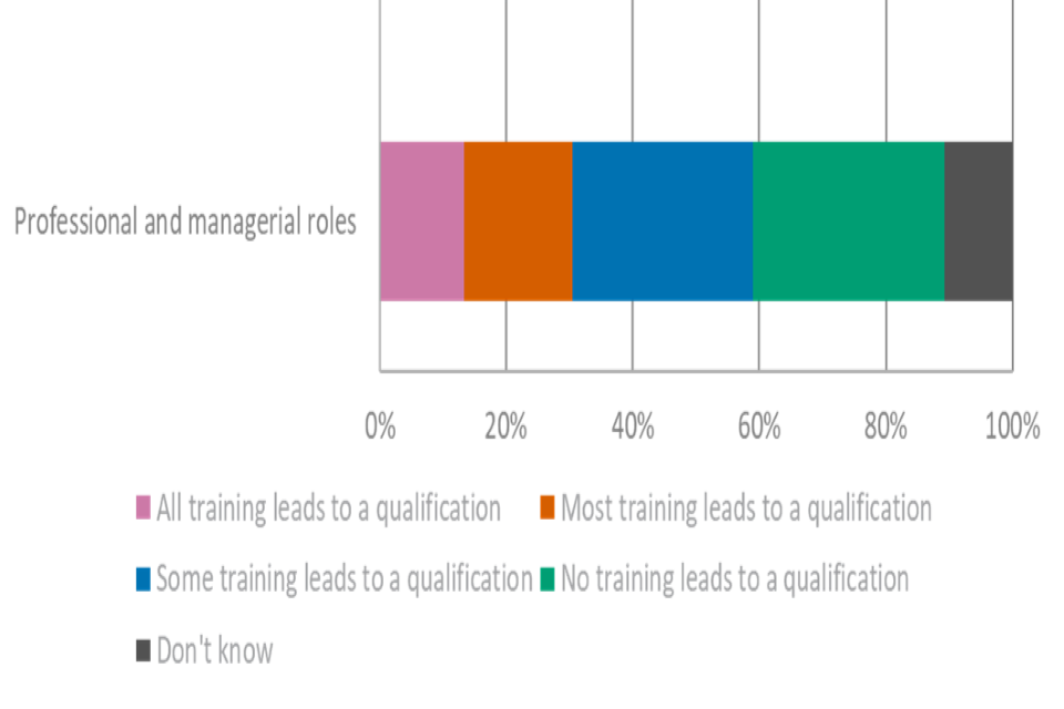 Micro and small employers were more likely than large employers to report that no training leads to qualifications for employees across all different roles. For professional and managerial roles, 34% of micro employers and 21% of small employers reported that no training they arranged or funded leads to a qualification compared to just 11% of large employers.