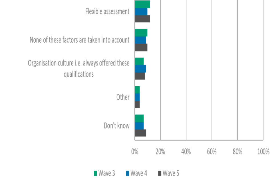 As shown in Figure 48, employers reported that the most common factor taken into account when they decide which qualification to offer their employees is the relevance of the qualification to their organisation (63%), this is broadly comparable to the previous waves.
