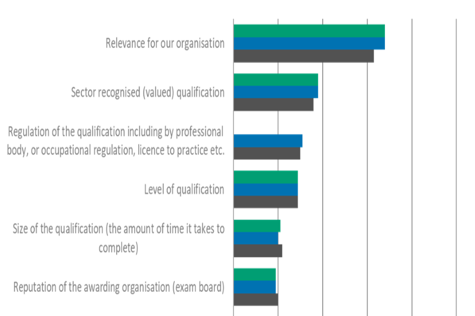 Just over a third (36%) of employers mentioned that the qualification being valued in their sector was a factor taken into consideration. One in ten (10%) employers, said that none of those factors are taken into account before their organisation decides which qualifications to offer.