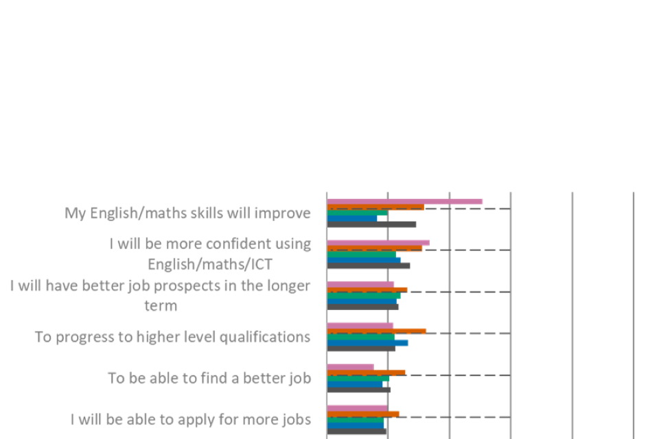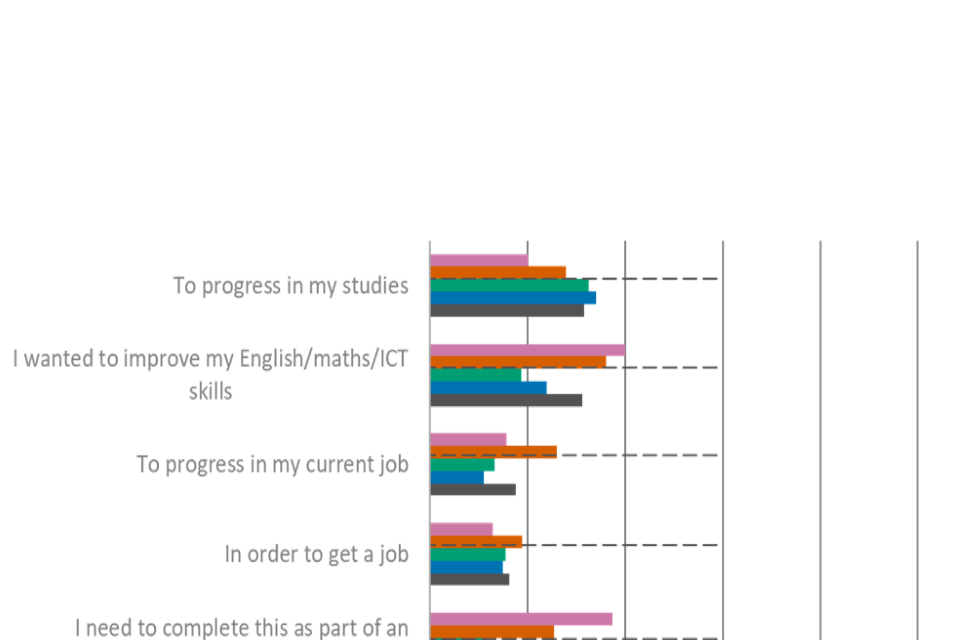 When it comes to key reasons why learners had undertaken an FSQ in the previous three years, the most common were to progress in their studies (32%) or to improve their English, maths or ICT skills (31%). Among learners who had started taking an FSQ, the top perceived benefits of doing so were to be more confident using (27%) or improving (29%) their English, maths or ICT skills.