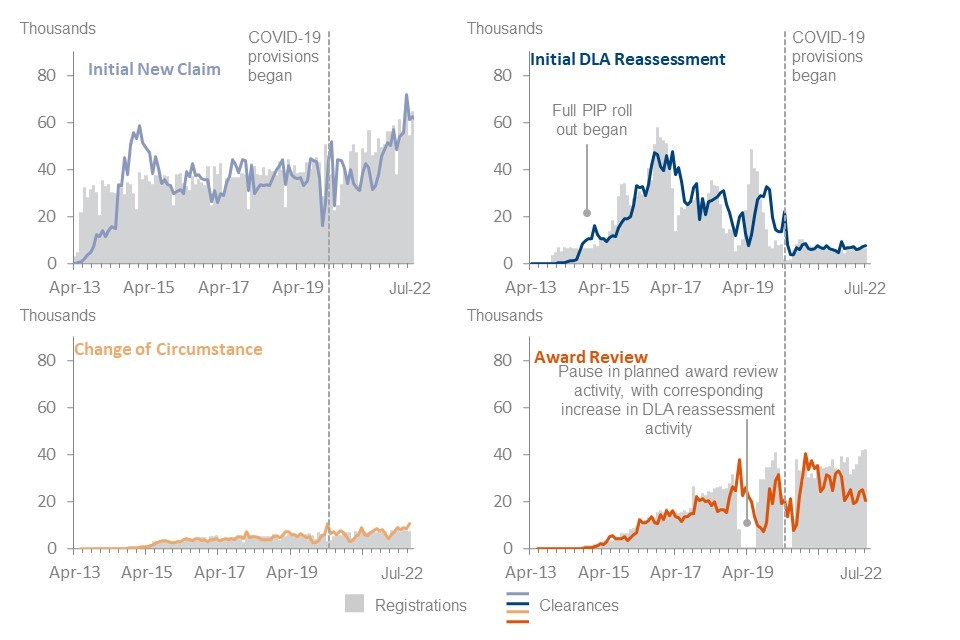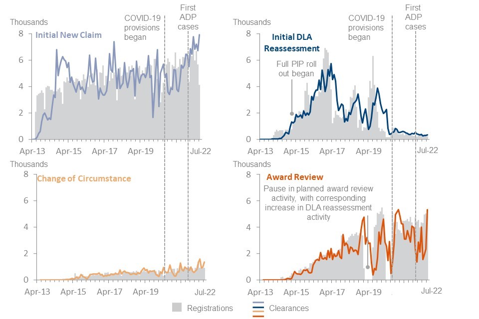 See Stat-Xplore for more information on registrations and clearances for new claims, DLA reassessments, planned award reviews and changes of circumstance.