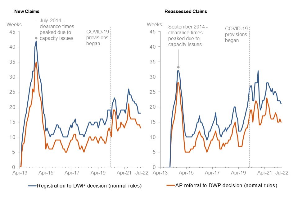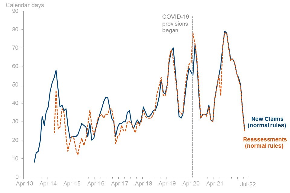 - Clearances show even higher levels of increase for new claims (67%) and changes of circumstance (40%) when comparing the quarter ending July 2022 to July 2021, though DLA reassessment clearances are only 5% higher and planned award review clearances are 21% lower.