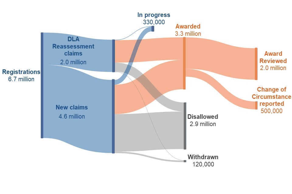 - 4.6 million registrations (69%) are new claims whilst 2.0 million (31%) are DLA reassessment claims