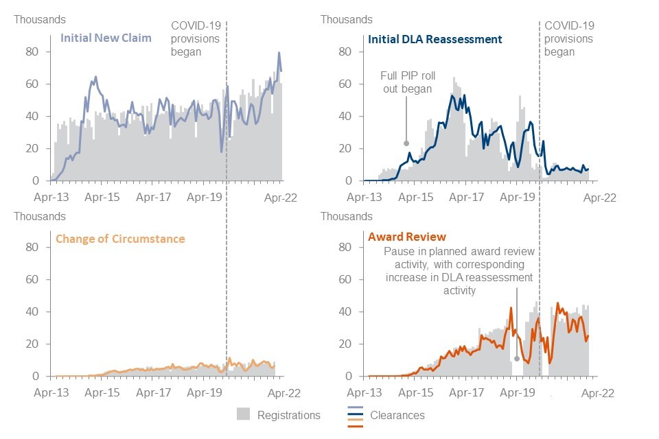 See Stat-Xplore for more information on registrations and clearances for new claims, DLA reassessments, planned award reviews and changes of circumstance.