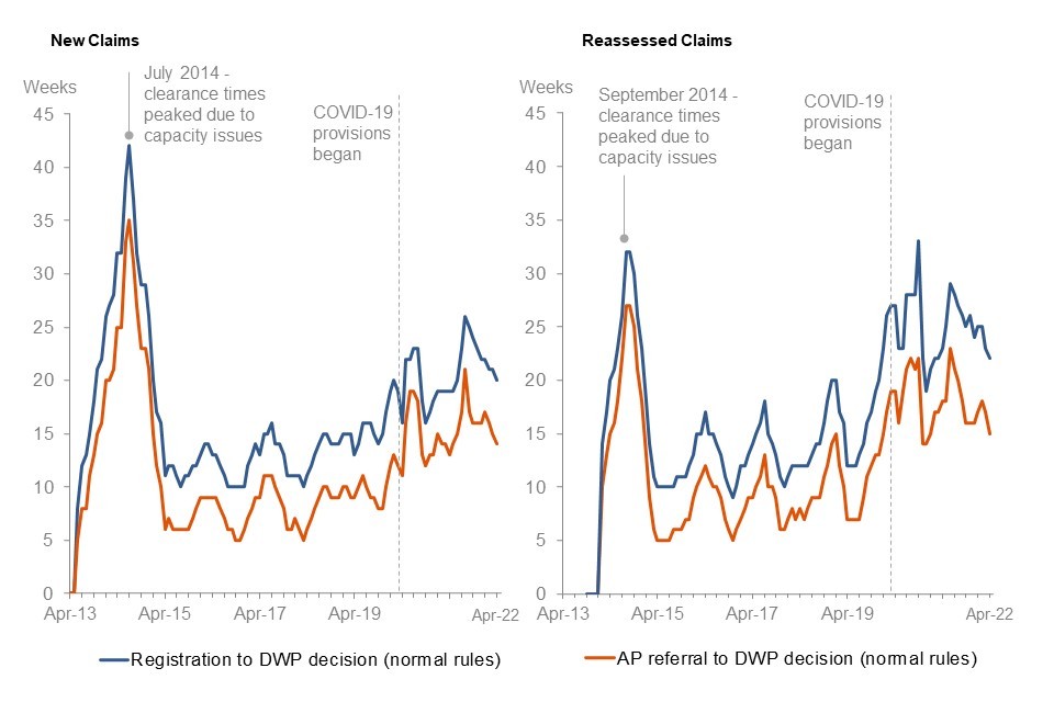 - Clearances show even higher levels of increase for new claims (62%) and changes of circumstance (18%) when comparing the quarter ending April 2022 to April 2021, though planned award review clearances are 32% lower and DLA reassessment clearances are 8% lower