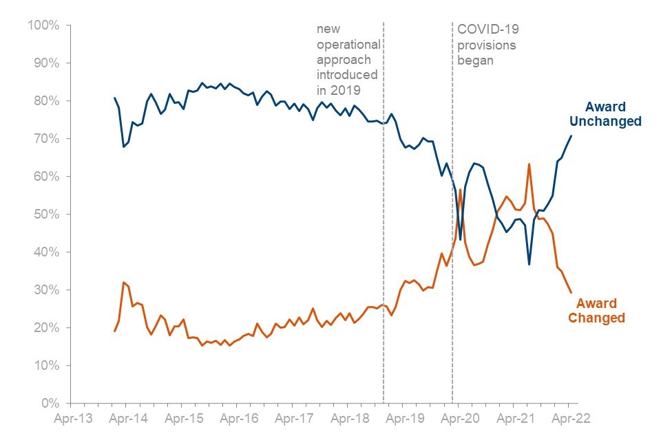 - 77% of the 370,000 changes of circumstances resulted in an increase or no change to the level of award received by the claimant