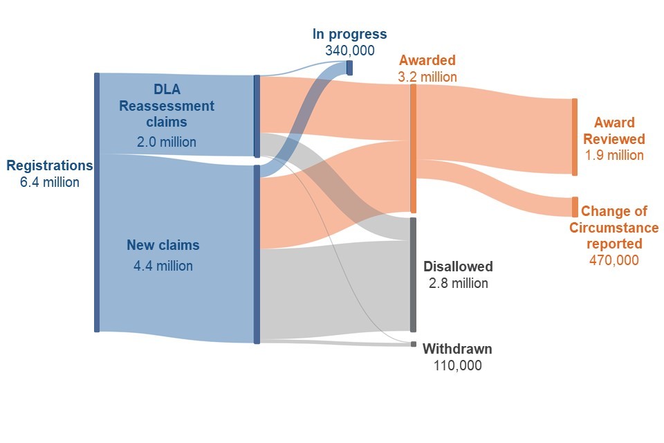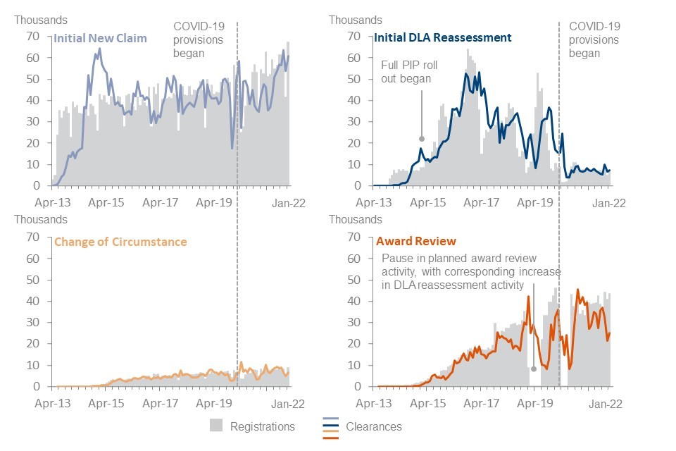 See Stat-Xplore for more information on registrations and clearances for new claims, DLA reassessments, planned award reviews and changes of circumstance.