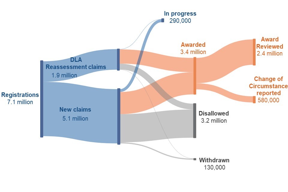 See Stat-Xplore for more information on registrations and clearances for new claims, DLA reassessments, planned award reviews and changes of circumstance.