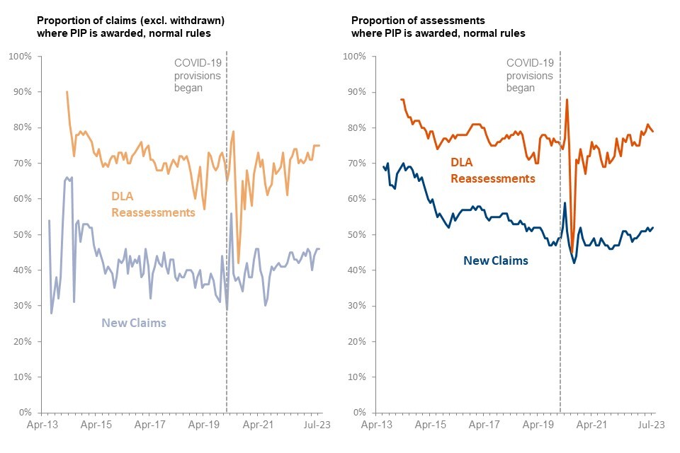 - clearance volumes for new claims and planned award reviews in the quarter ending July 2023 were 13% and 62% higher respectively than in quarter ending July 2022, whereas change of circumstance clearances were 13% lower and DLA reassessment clearances were 19% lower over the same period