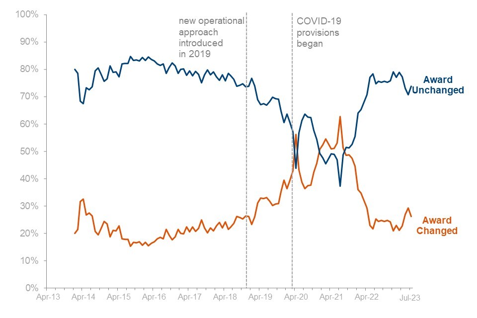 2.4 million claims have had a planned award review registered and 580,000 claims have reported a change in circumstances between April 2013 and July 2023.