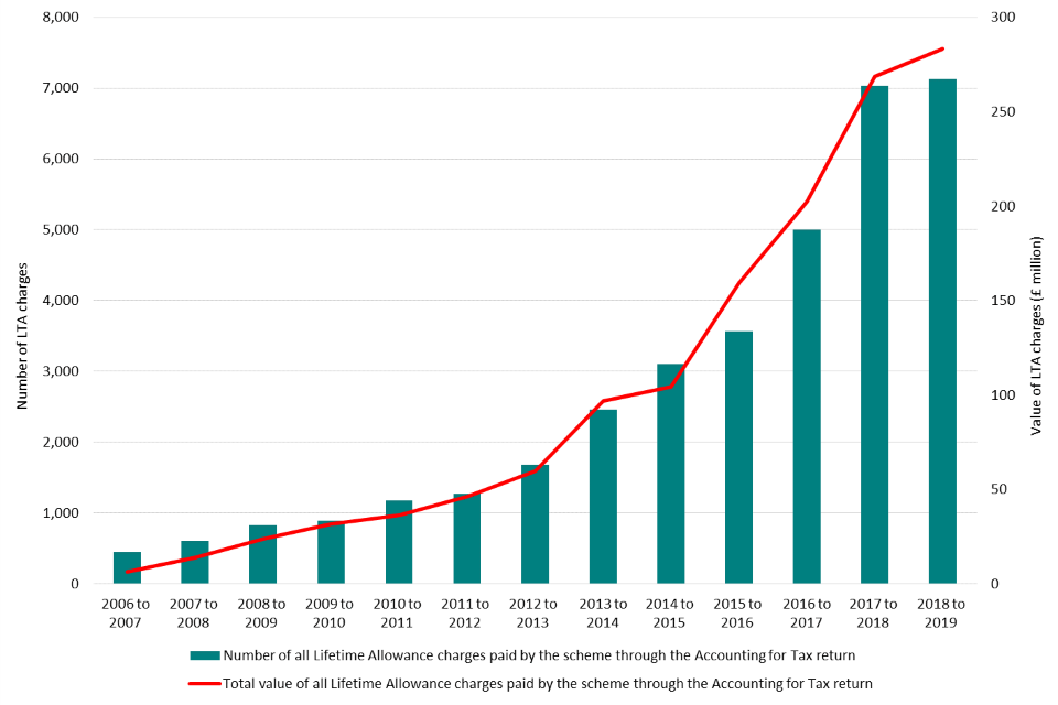 In 2018 to 2019, 7,130 LTA charges were reported by schemes through AFT returns. The total value of LTA charges reported by schemes in 2018 to 2019 was £283 million, a 6% increase from £269 million in 2017 to 2018.