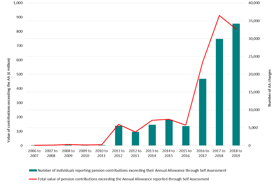 In 2018 to 2019, 34,220 tax payers reported pension contributions exceeding their AA through Self Assessment. The total value of contributions reported as exceeding the AA was £817 million in 2018 to 2019, decreasing from £912 million in 2017 to 2018 and £584 million in 2016 to 2017 (when the Tapered AA was introduced).