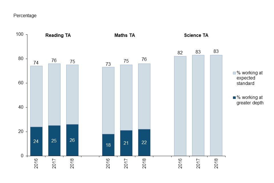 In maths TA, attainment at the expected standard increased by 1 percentage point to 76%. Attainment in reading TA and science TA remained the same compared to 2017. The change in reading TA was less than 0.5 percentage points using unrounded data, so is rounded to zero.