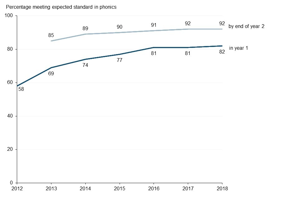 More than 4 in 5 pupils (82%) met the expected standard in the phonics screening check in year 1, a 1 percentage point increase from 2017. By the end of year 2, more than 9 in 10 pupils (92%) met the standard, the same proportion as in 2017.