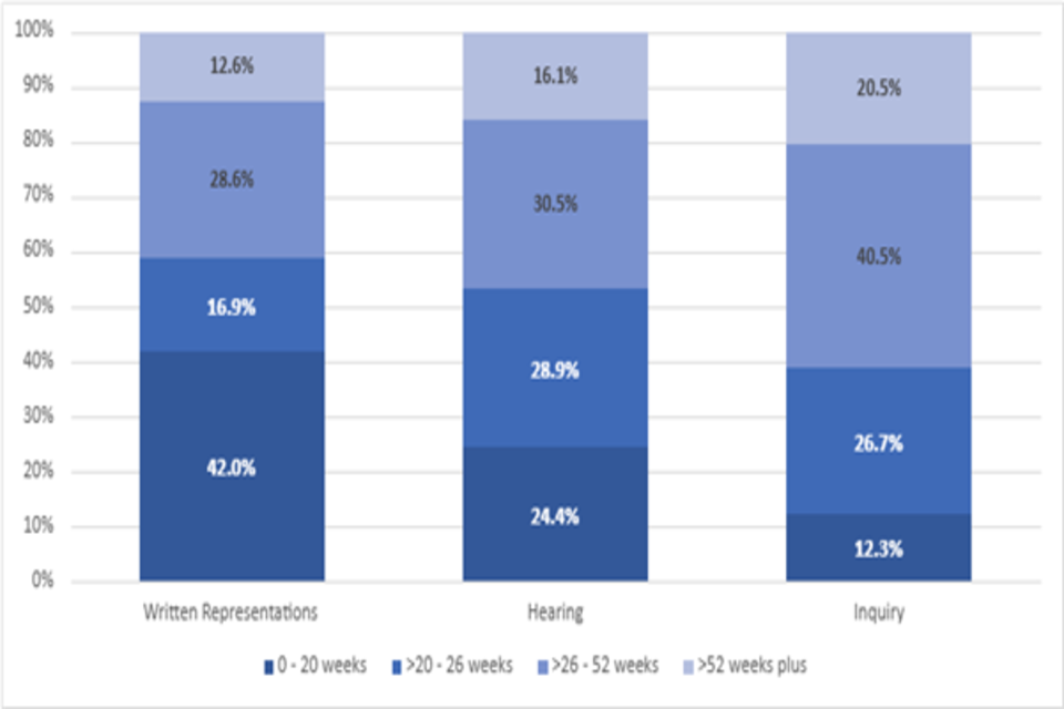 It also shows that a greater proportion of cases decided by written representations are decided within 20 weeks (42.0%) than those decided by hearings (24.4%) or inquiries (12.3%).