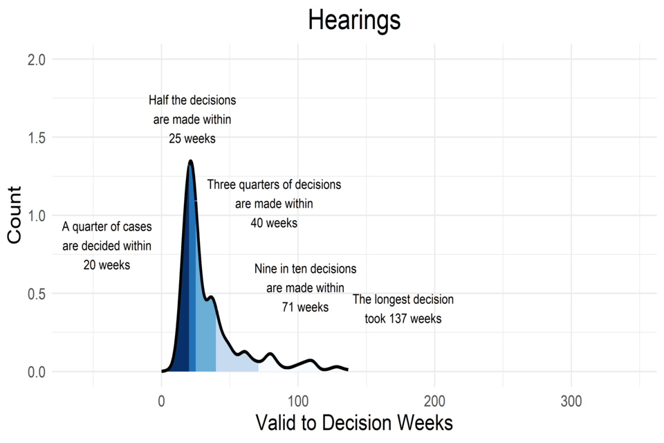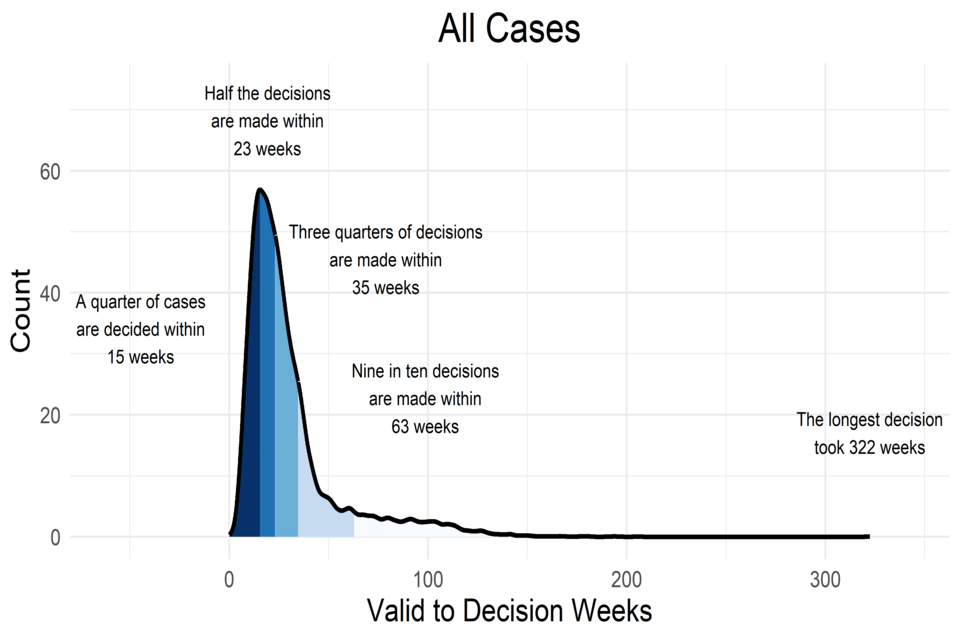 Note: The figure for “Half the decisions are made within” is the 50th percentile; this is the same as the median time to decide these cases, which is how this is presented in the quarterly Official Statistics publication.