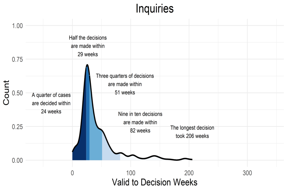 - Nine in ten cases decided wholly by written representations are decided within 62 weeks. The corresponding time for nine out ten cases decided wholly or partly by hearings is 71 weeks and for inquiries it is 82 weeks.