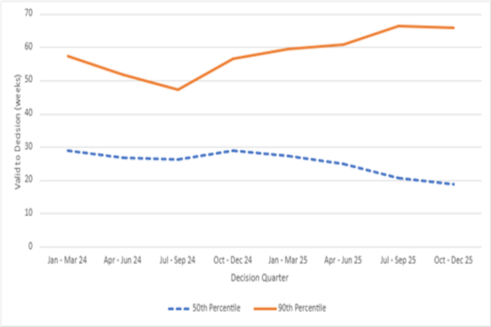 Table 2 below shows the 25th, 50th, 75th and 90th percentiles for valid to decision, in weeks, for the decisions made from January 2025 to December 2025. Note that these match the timings given in text on the shapes in Figure 3 above.