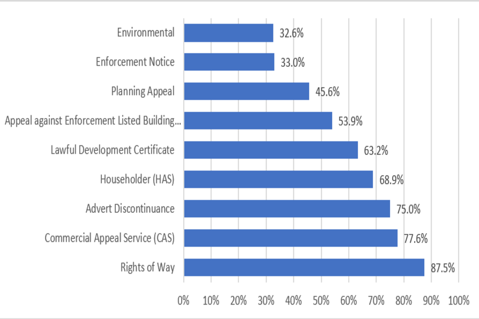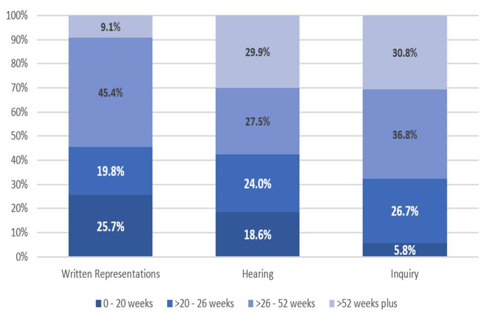 It also shows that a greater proportion of cases decided by written representations are decided within 20 weeks (26%) than those decided by hearings (19%) or inquiries (6%).