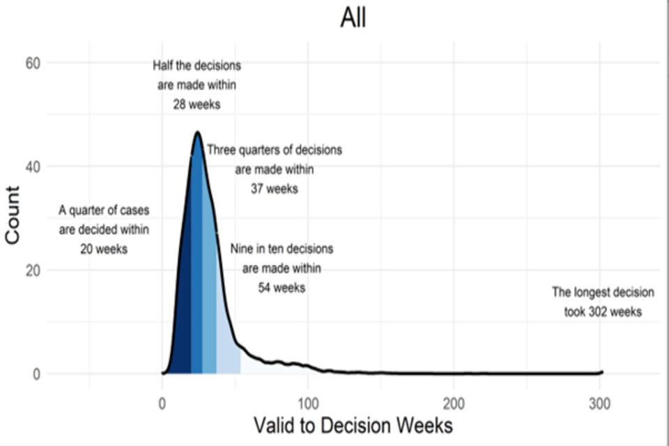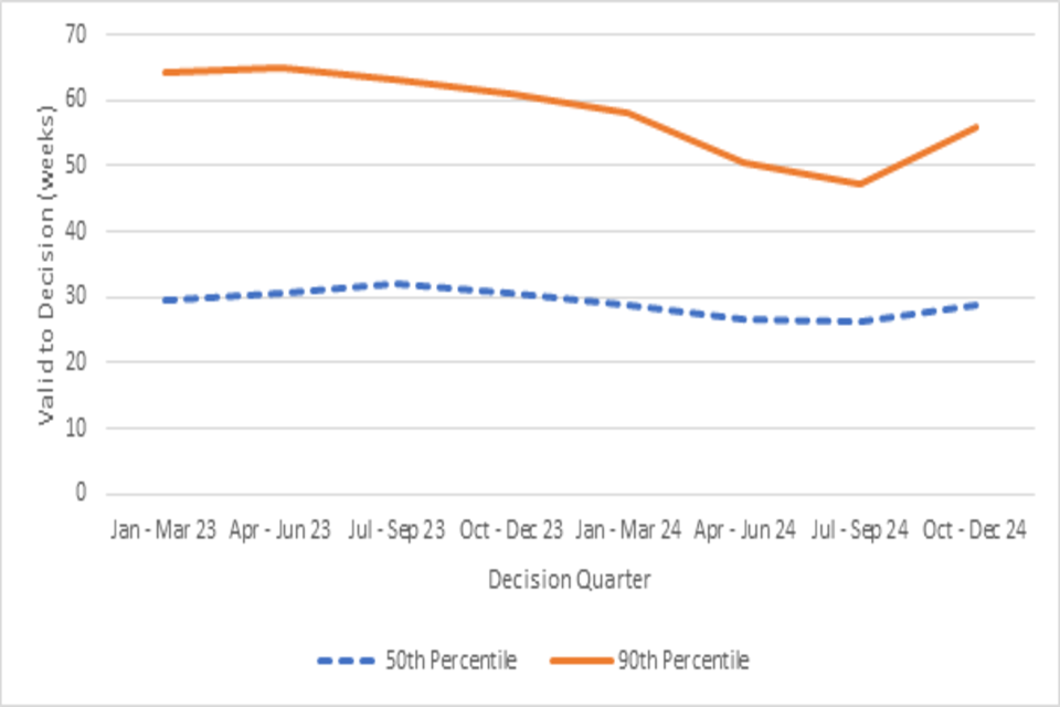 Table 2 below shows the 25th, 50th, 75th and 90th percentiles for valid to decision, in weeks, for the decisions made from January 2024 to December 2024. Note that these match the timings given in text on the shapes in Figure 3 above.