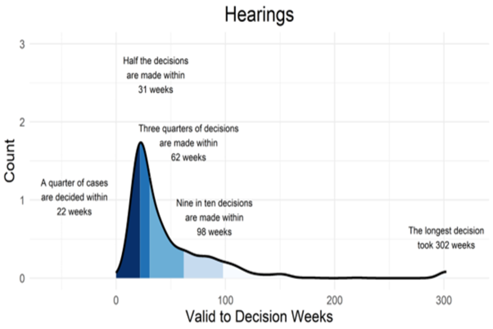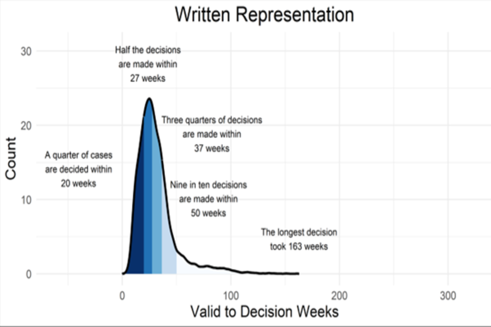 - The spread of time taken to decide for all cases, is similar to the spread for those decided wholly by written representations. This is because the large majority (16,734/18,034 which is 93%) of cases are decided this way.