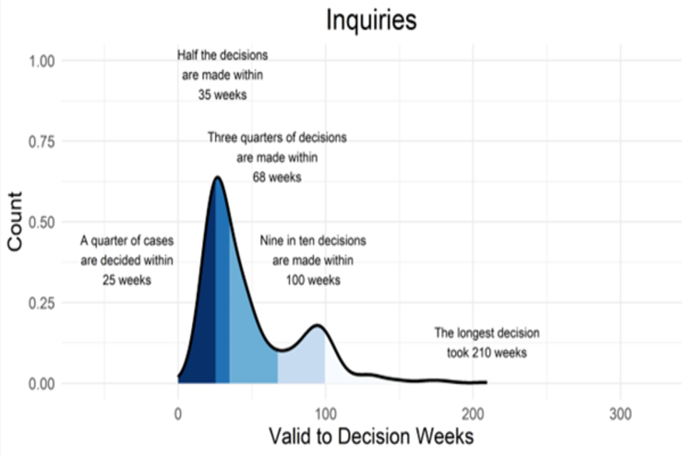 - Nine in ten cases decided wholly by written representations are decided within 50 weeks. The corresponding time for nine out ten cases decided wholly or partly by hearings is 98 weeks and for inquiries it is 100 weeks.
