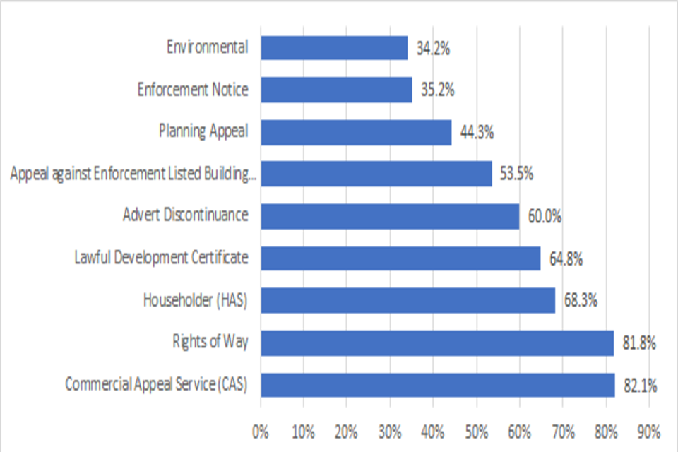 No new analysis relevant to this measure is presented this quarter. The Planning Inspectorate have worked with the Institute for Customer Service to conduct a satisfaction survey. The data capture phase was carried out in April and early May 2023. The results of this survey show that Planning Inspectorate was given an overall satisfaction score of 56.8.