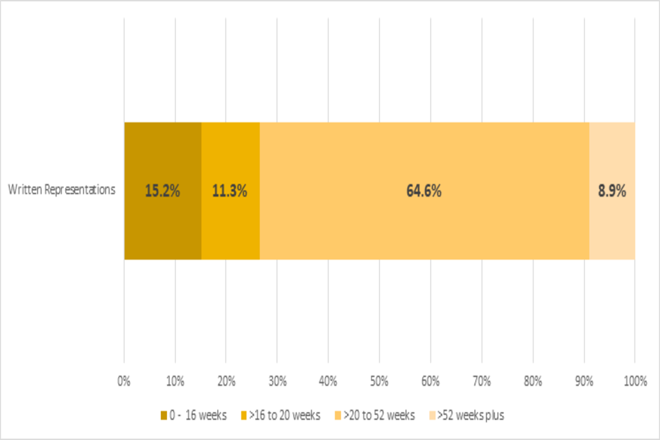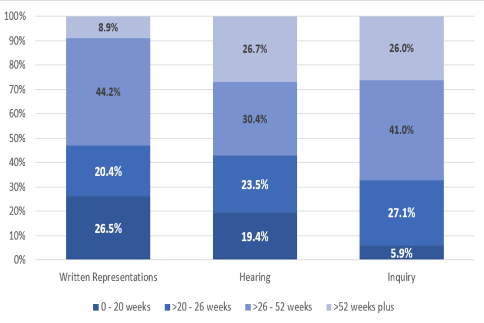 It also shows that a greater proportion of cases decided by written representations are decided within 20 weeks (27%) than those decided by hearings (19%) or inquiries (6%).