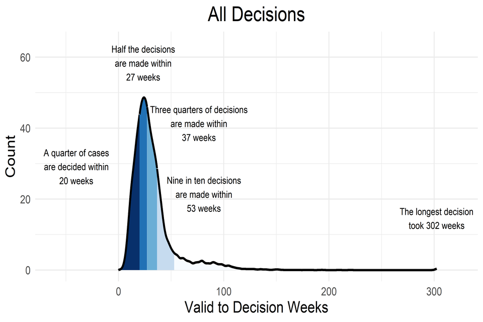 Note: The figure for “Half the decisions are made within” is the 50th percentile; this is the same as the median time to decide these cases, which is how this is presented in the quarterly Official Statistics publication.