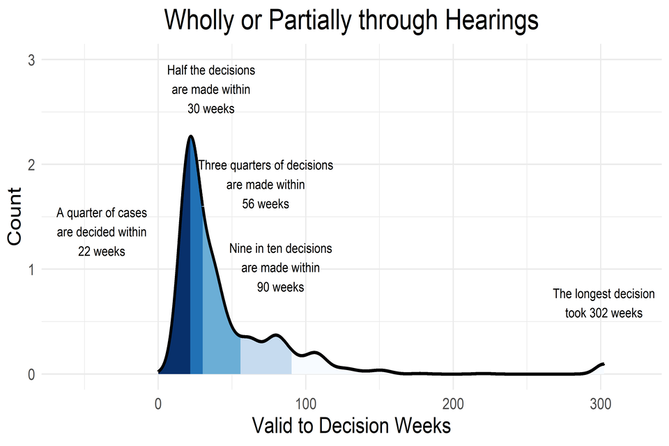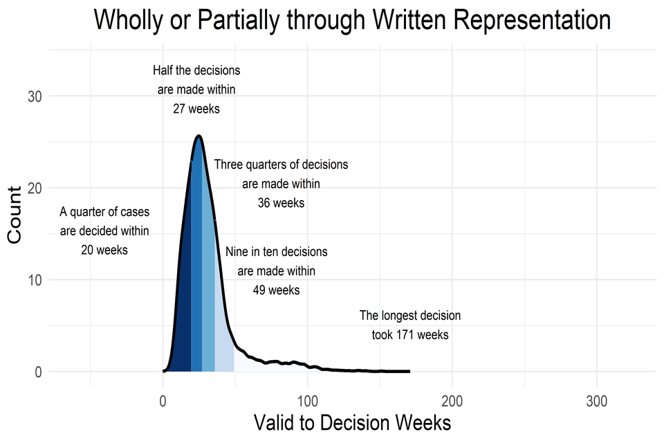 - The spread of time taken to decide for all cases, is similar to the spread for those decided wholly by written representations. This is because the large majority (16,910/18,345 which is 92%) of cases are decided this way.
