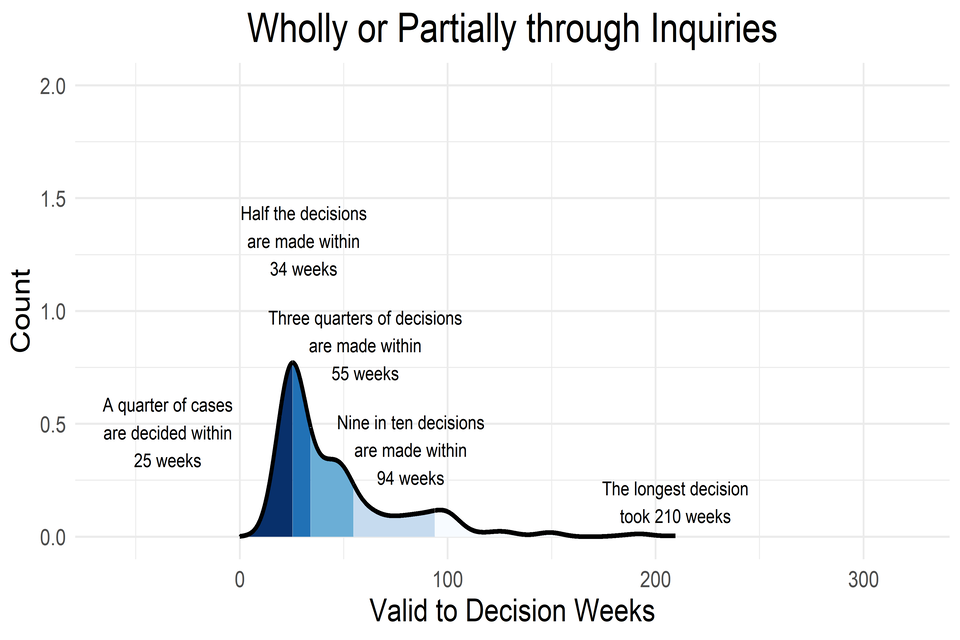 - Nine in ten cases decided wholly by written representations are decided within 49 weeks. The corresponding time for nine out ten cases decided wholly or partly by hearings is 90 weeks and for inquiries it is 94 weeks.