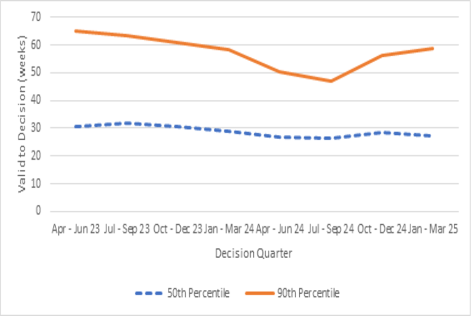 Table 2 below shows the 25th, 50th, 75th and 90th percentiles for valid to decision, in weeks, for the decisions made from April 2024 to March 2025. Note that these match the timings given in text on the shapes in Figure 3 above.