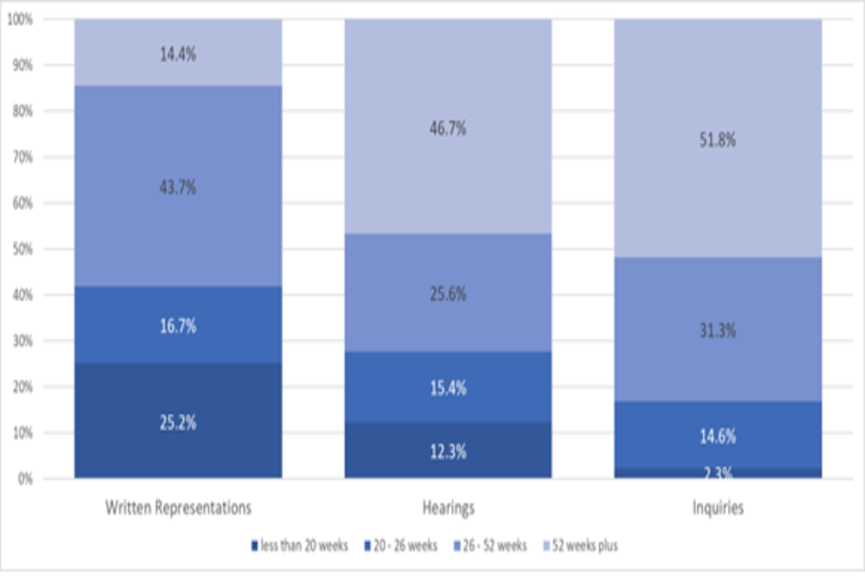 It also shows that a greater proportion of cases decided by written representations are decided within 20 weeks (25%) than those decided by Hearings (12%) or Inquiries (3%).