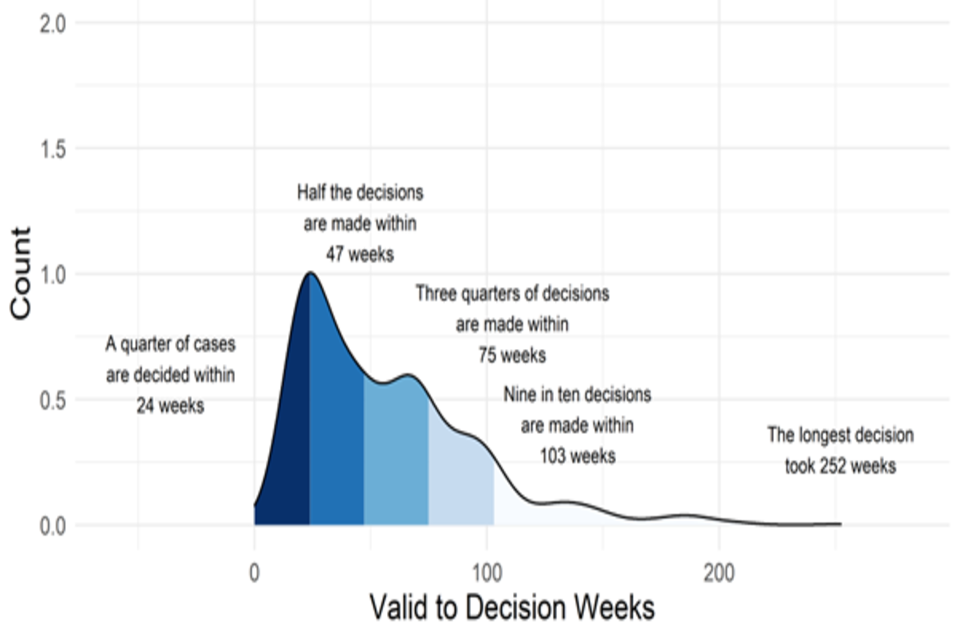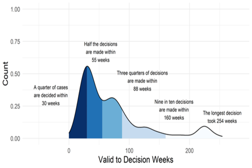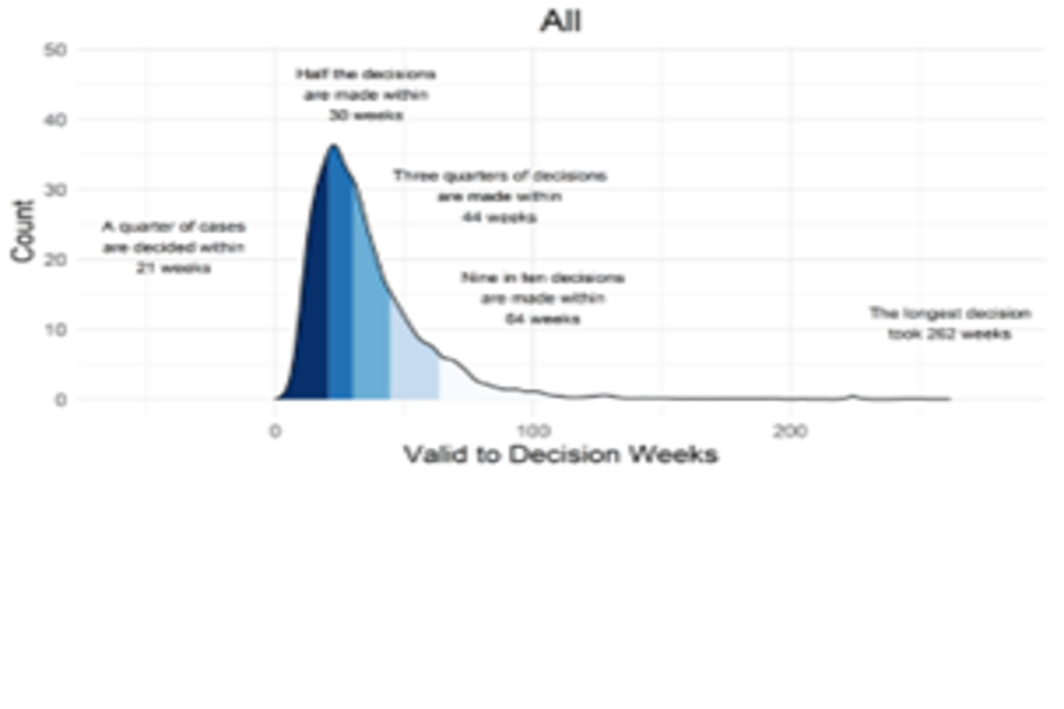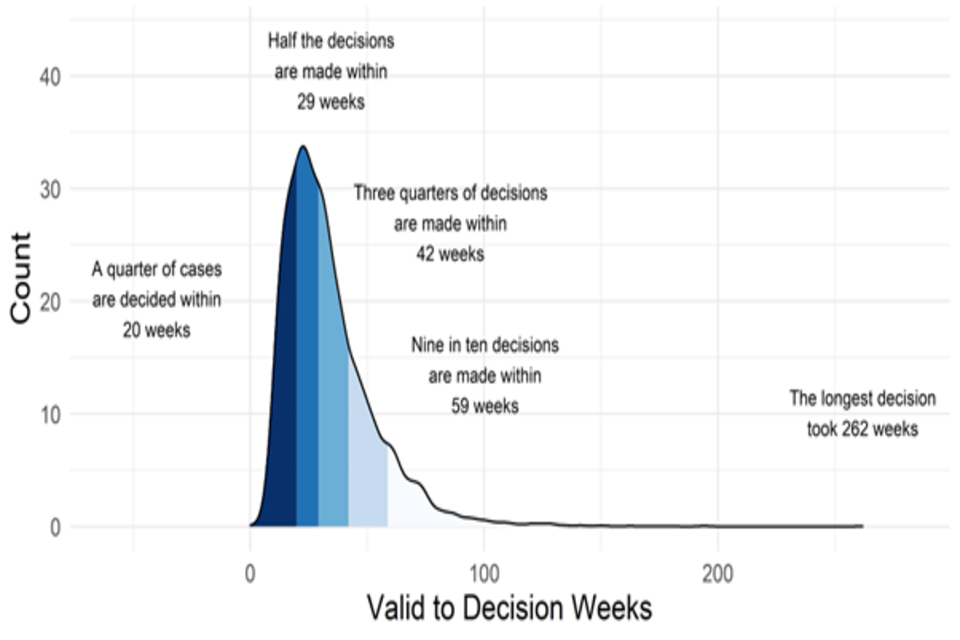 Table 2 below shows the 25th, 50th, 75th and 90th percentiles for valid to decision, in weeks, for the decisions made from August 2022 to July 2023. Note that these match the timings given in text on the shapes in Figure 3 above.