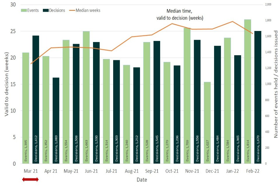 Figure 1: Number of events held , decisions issued and median time between valid date & decision date; March 2021 to February 2022