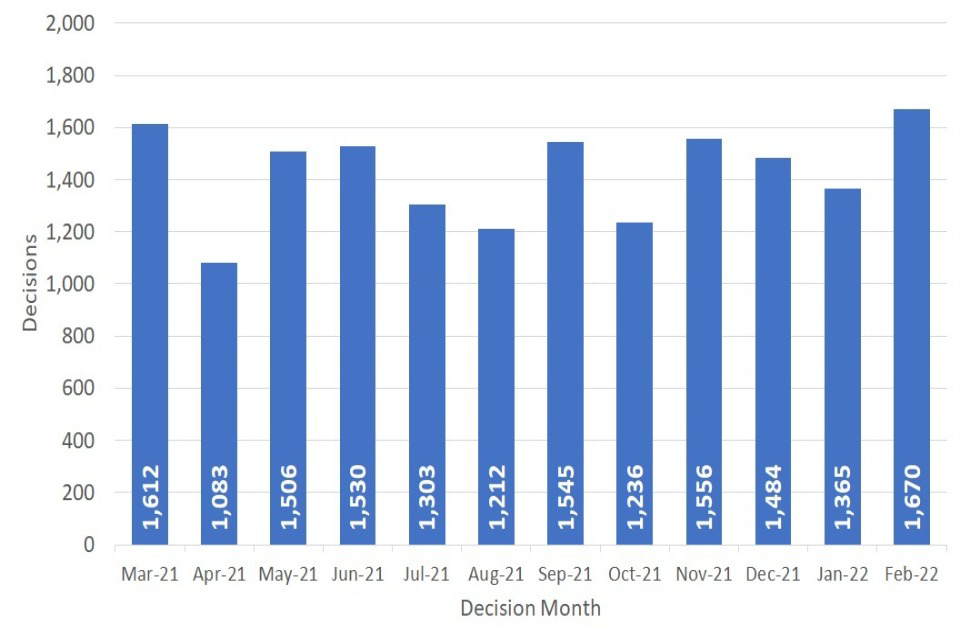 The number of decisions issued in February 2022 was 1,670; an increase of just over 300 decisions compared to January 2022.