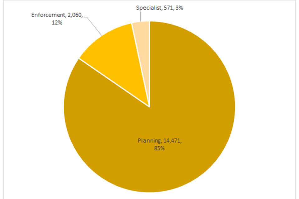 The large majority of cases were planning (14,471). This is about eighty-five per cent of all appeal decisions made. There were 2,060 enforcement decisions and 571 specialist decisions. These totals are also shown in Table 4 above and Figure 4 below.