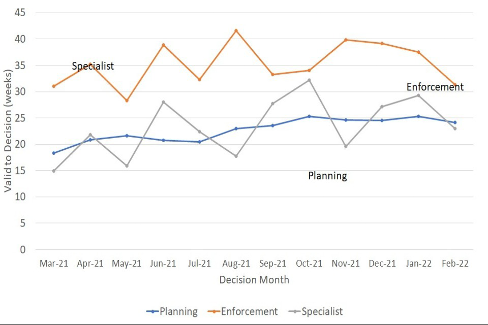 The median time for planning cases was above 20 weeks for the last 11 months; and around 25 weeks for the last 4 months. Across the whole year, the median time to decision is 22 weeks.