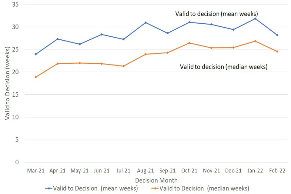 The median time to decide a case in February 2022 was 25 weeks. The median time to decide was around 19 weeks during March 2021, and has increased to 24 weeks and over for the last 7 months.