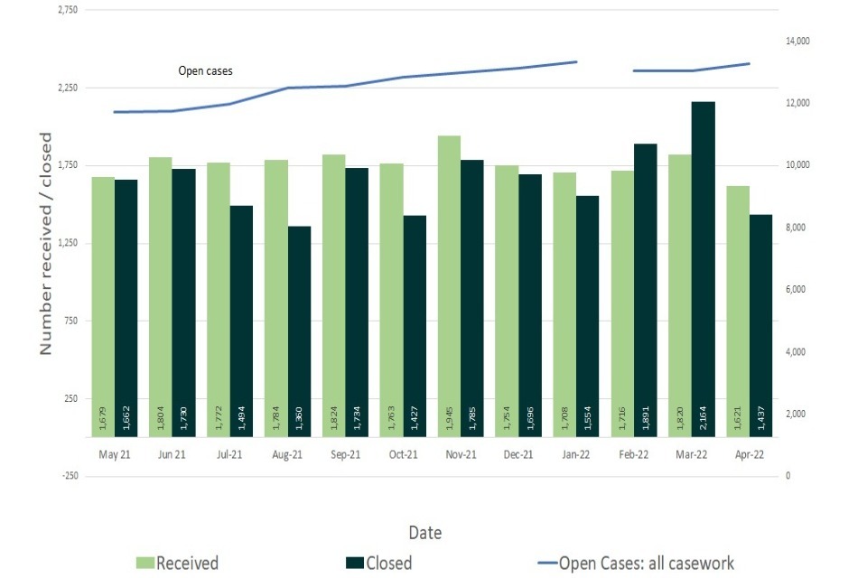 Figure 2: Number of cases received, closed and open; May 2021 to April 2022