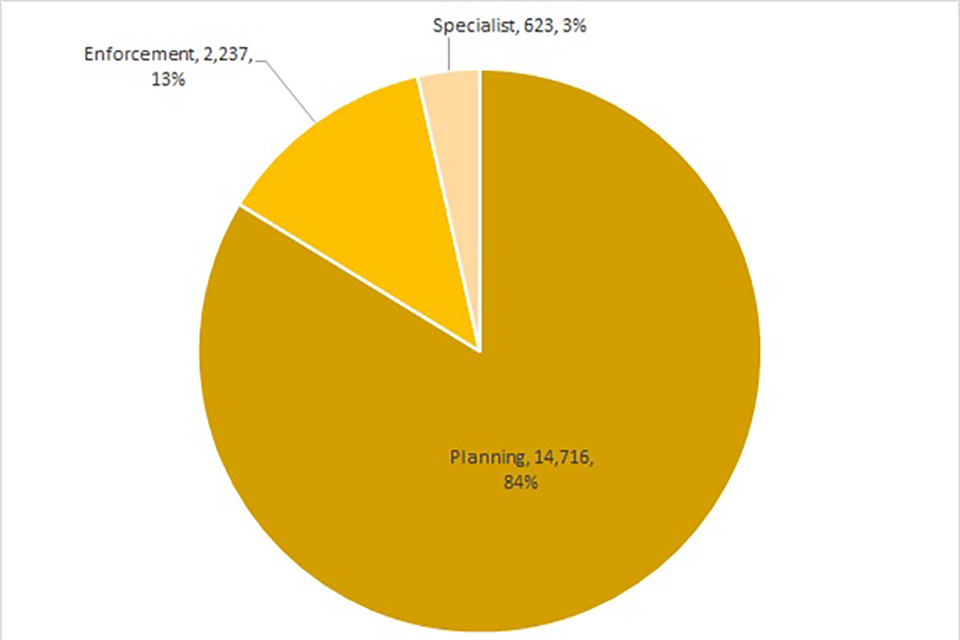 The large majority of cases were planning (14,716). This is about eighty-four per cent of all appeal decisions made. There were 2,237 enforcement decisions and 623 specialist decisions. These totals are also shown in Table 4 above and Figure 4 below.