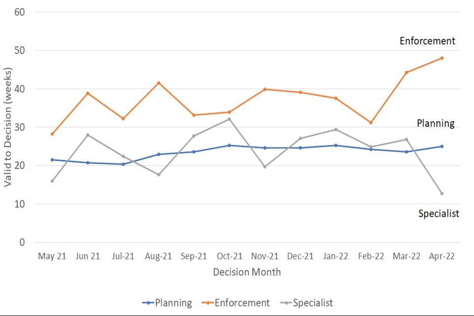 The median time for planning cases was at or above 20 weeks for each of the last 12 months; and 24 weeks or more for the last eight months. Across the whole year, the median time to decision is 23 weeks.